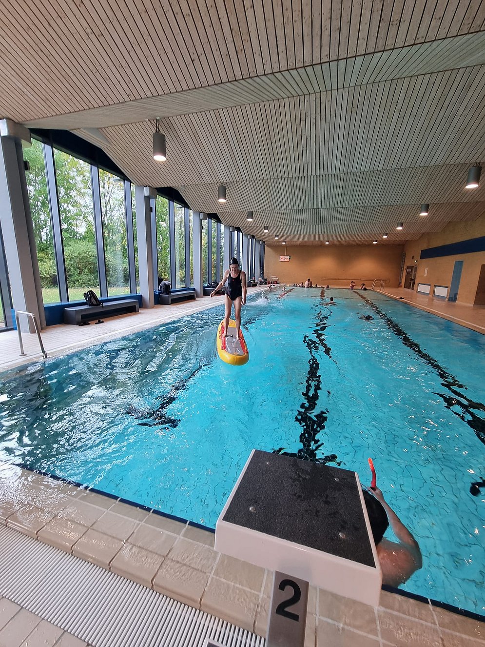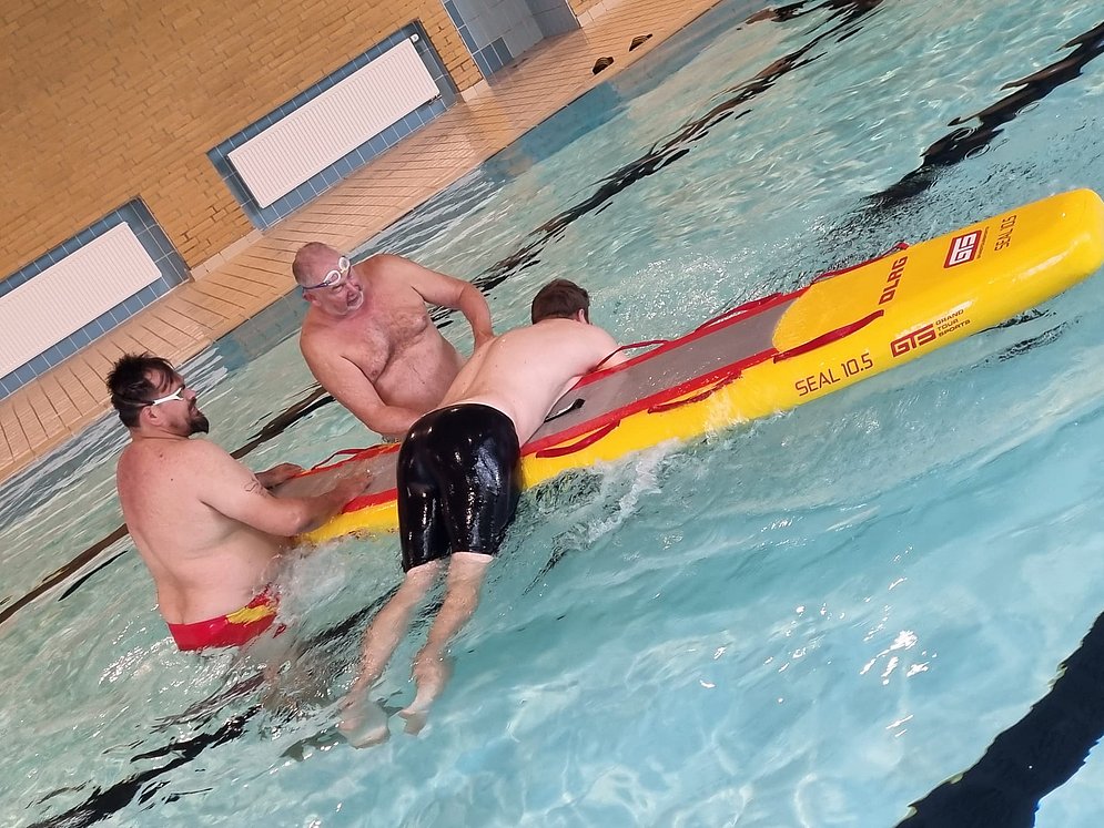 Nach so viel Theorie hieß es am Sonntag: Ab ins Wasser! In der Schwimmhalle in Gieboldehausen wurden die neuen Erkenntnisse direkt in die Praxis umgesetzt. Die Ausbilder übten einige Sachen aus dem neuen Schnorchelabzeichen und erprobten die Handhabung der Ausbildungsgeräte.
